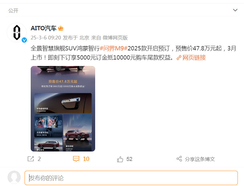 3月6日,AITO汽车在官方微博正式宣布,将在3月正式发布问界M9 2025款。预售价47.8万元起,即刻下订享5000元订金抵10000元购车尾款权益。