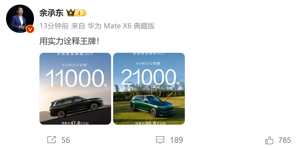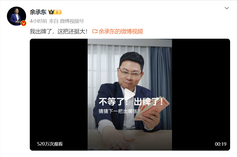 华为常务董事、终端BG董事长、智能汽车解决方案BU董事长余承东在微博发文表示:“用实力诠释王牌! ”