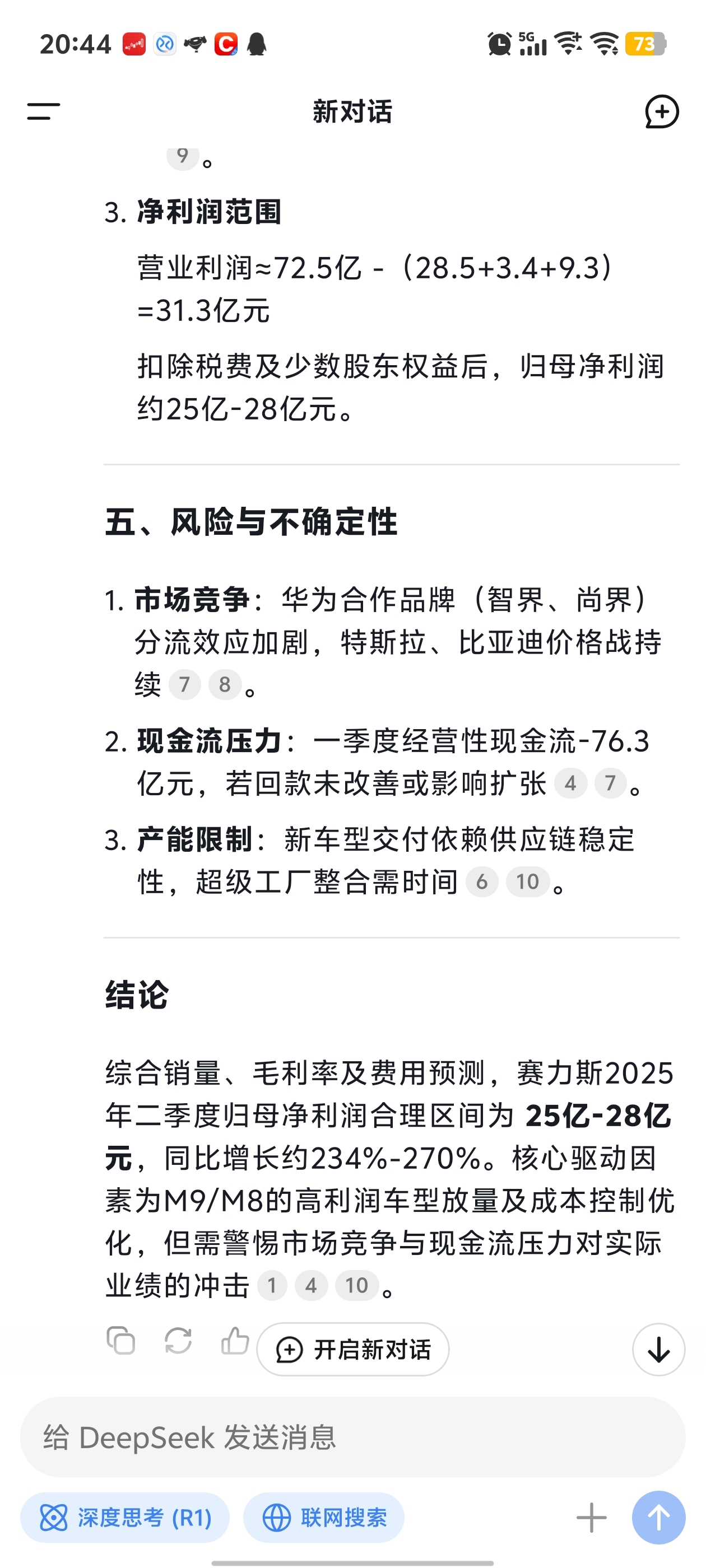 $赛力斯(SH601127)$ Deepseek,的模型给出的二季度大概25-30亿利润,但是计算模型,M8按照3-4万辆计算,M9按照3万辆计算。我们要知道,目前大定6万M8,二季度肯定交付的,9,每个月也有1.5万辆。这样算,那二季度利润,就直接起飞了。40亿差不多