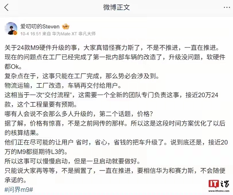 $赛力斯(SH601127)$ IT之家 10 月 5 日消息,博主 @爱叨叨的Steven 昨日发文透露,关于 24 款 M9 硬件升级的事,赛力斯一直在推进,现在工厂已经完成了第一批内部车辆的改造,升级没问题、软硬件都 OK。但复杂点在于只能在工厂完成,会涉及到物流运输、工厂改造、车辆再交付给用户等流程。