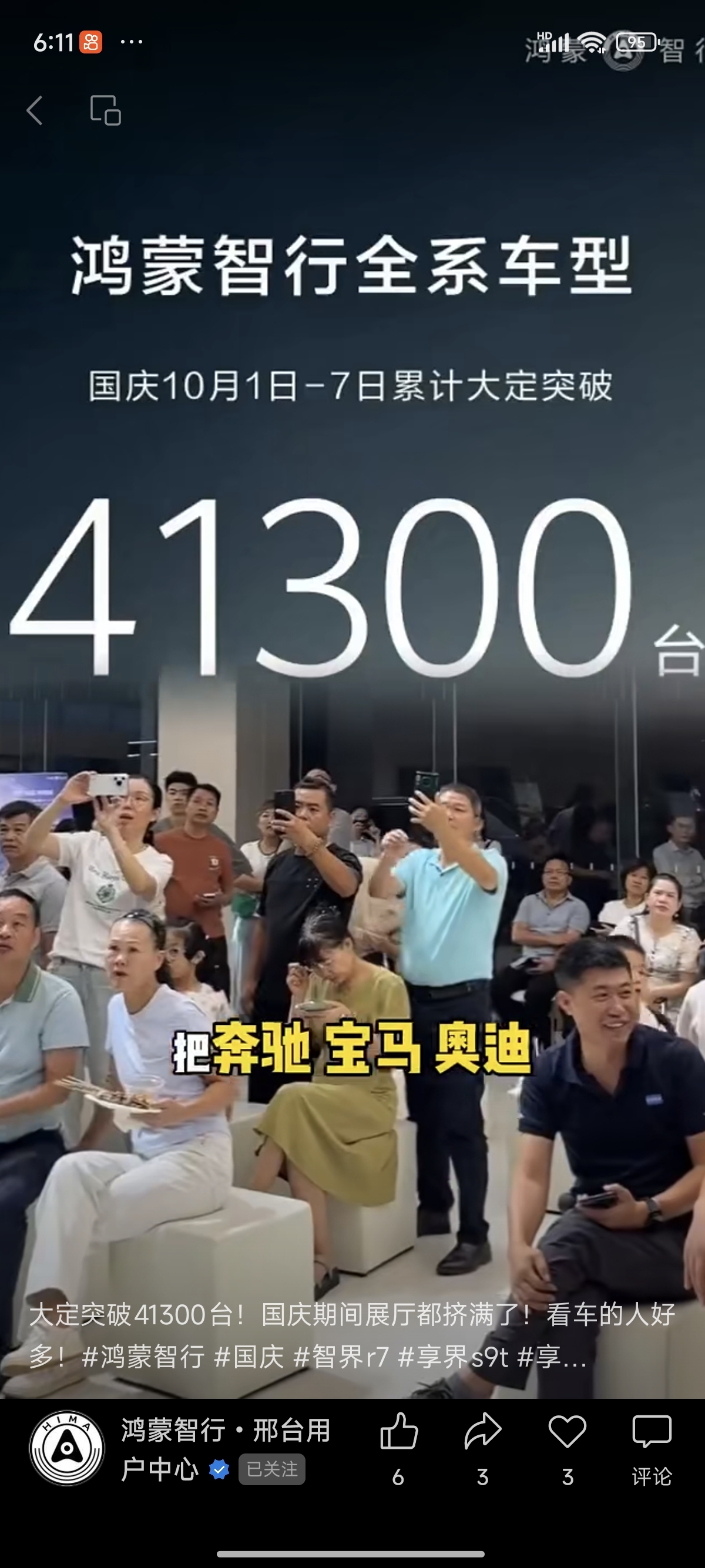 $赛力斯(SH601127)$ $奇瑞汽车(HK|09973)$ $北京汽车(HK|01958)$ 鸿蒙智生国庆7天大定41300台,日均5900台,真的是猛,主战的仍是赛力斯问界一路领跑,奇瑞智界和北汽享界s9T表现也不错,上汽尚界刚起步,江淮尊界一车难求