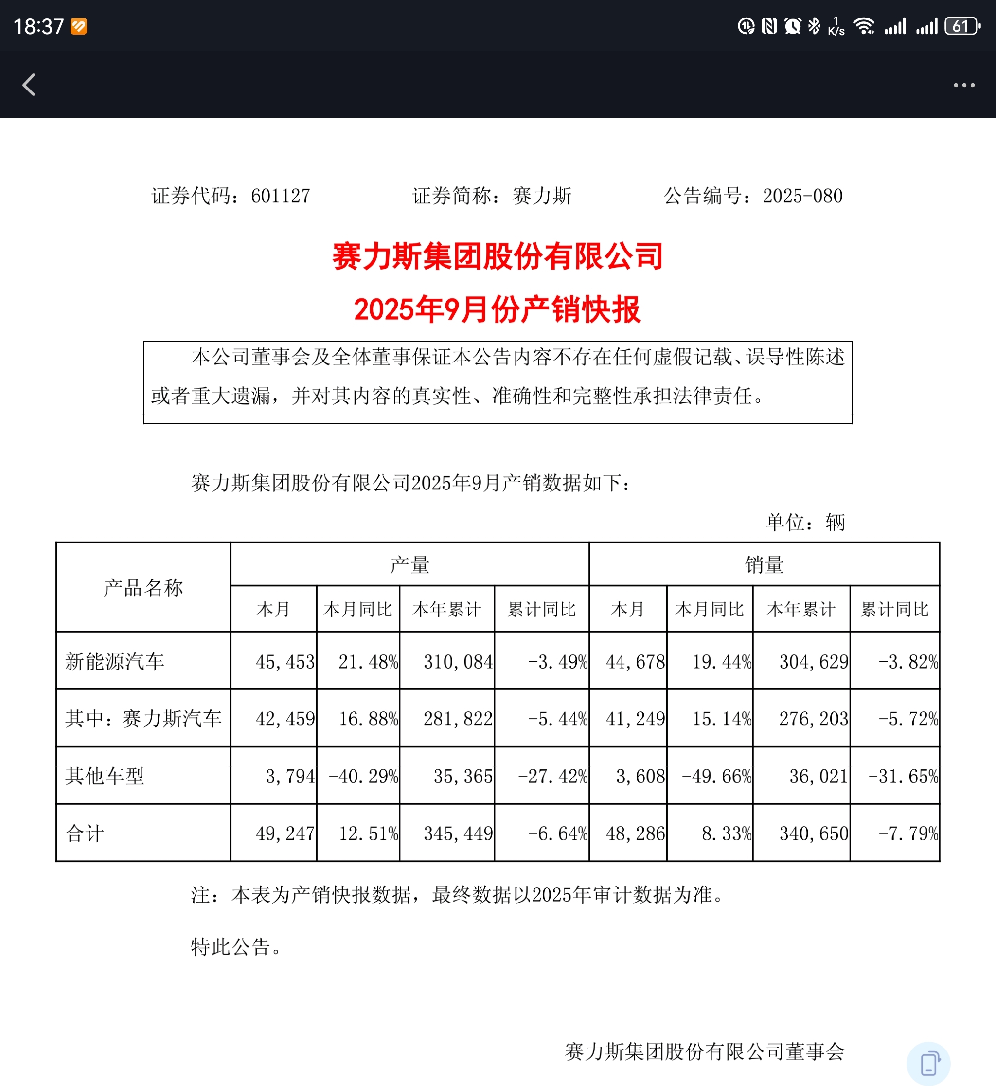 根据赛力斯于10月8日发布的最新产销快报,公司9月份总销量为48286辆,其中新能源汽车销量尤为关键。综合多个信息源,赛力斯9月份新能源汽车销量为44700辆左右 [181][182][183]同比增长约19.44% [183][241]。