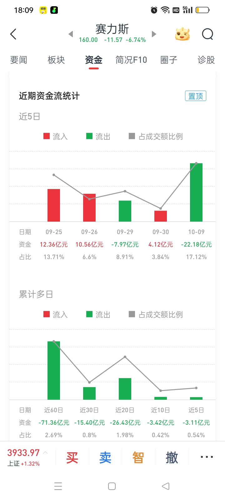 #炒股日记# 从9.22日到今天10.9日资金分布图来看。资金已经打负数了。但奇怪的是今天资金跑了22亿多。怎么没有跌停。意味着3亿多跌一个点!如果是一般的股票。它今天这样砸盘,早就跌停了。今天的盘面说明什么?各位股友发表一下意见啥?