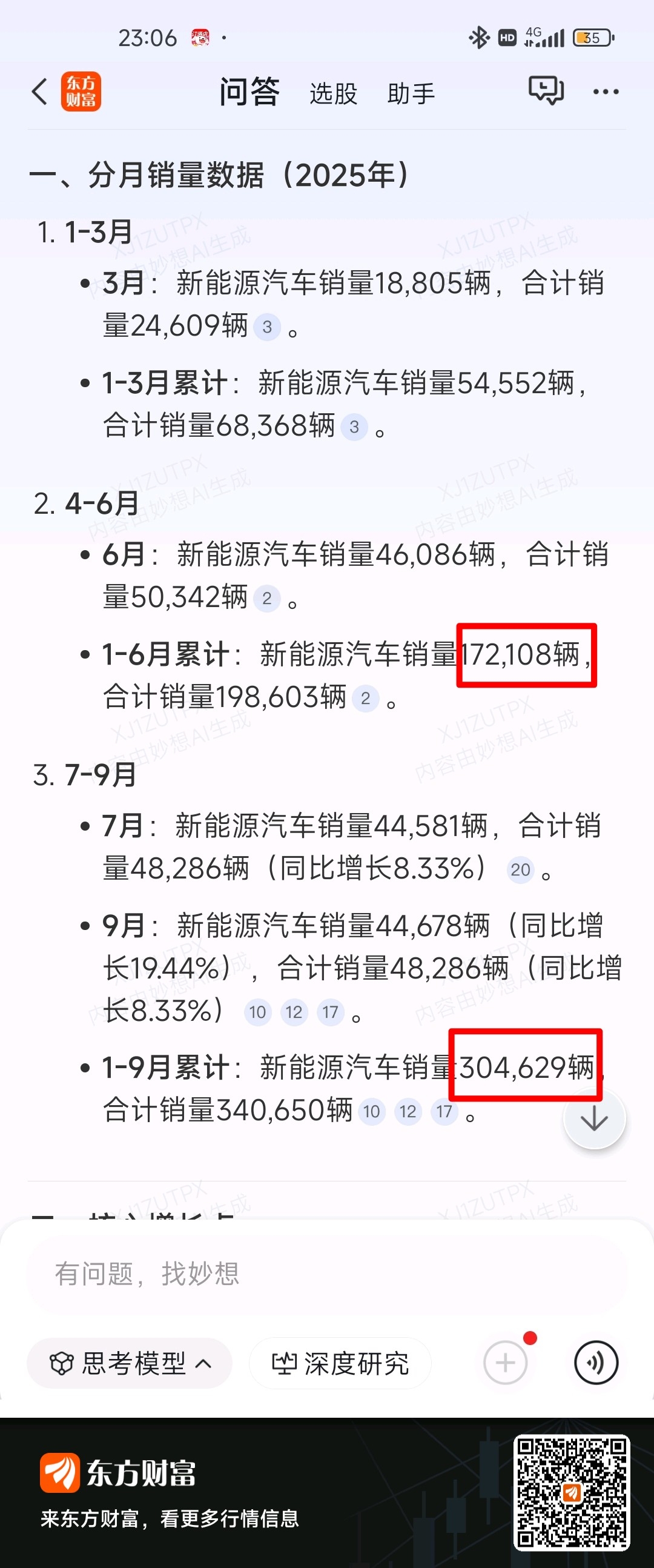 新能源车上半年销售17万辆,前三季度销售30万辆,也就是三季度销售了13万辆,比