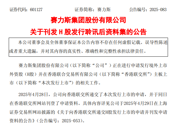 同日晚间,赛力斯(601127.SH)发布《关于刊发H股发行聆讯后资料集的公告》称,2025年10月9日,香港联交所上市委员会举行上市聆讯,审议公司本次发行上市的申请。根据本次发行上市的时间安排,公司按照有关规定在香港联交所网站刊登本次发行聆讯后资料集,该聆讯后资料集为公司根据香港联交所、香港证券及期货事务监察委员会的要求而刊发,刊发的目的仅为提供信息予香港公众人士和合资格的投资者。