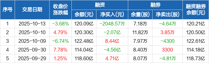 融资方面,当日融资买入13.86亿元,融资偿还14.07亿元,融资净偿还2048.57万元。融券方面,融券卖出6500股,融券偿还5.29万股,融券余量7.18万股,融券余额1159.57万元。融资融券余额合计120.21亿元。