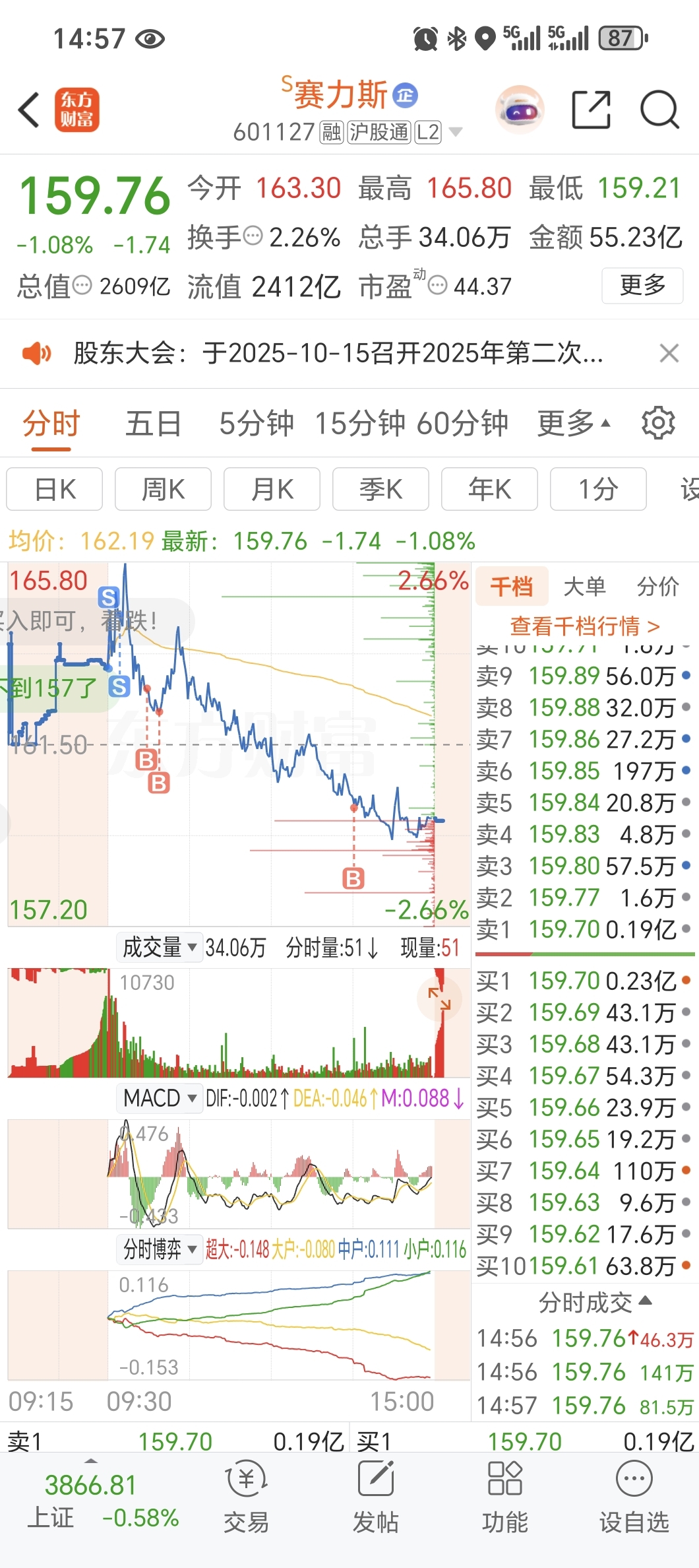 $赛力斯(SH601127)$ 明天止盈了,短期高点了,上周高开跑了,又买回来吃面,少赚7个点,郁闷