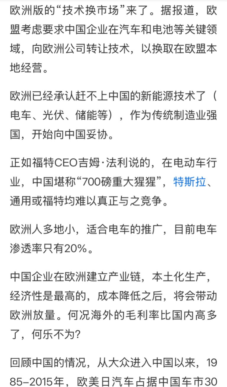 很多新闻媒体言辞犀利,可以理解,但也不必过分敏感,国家自有办法应对。请换位思考,外国企业要进入中国市场,带来行业冲击,我们国家会怎样应对呢?过去几十年,我们国家大发展,很多行业都是例子,逐步开放,获取技术,博弈一番,太正常啦
