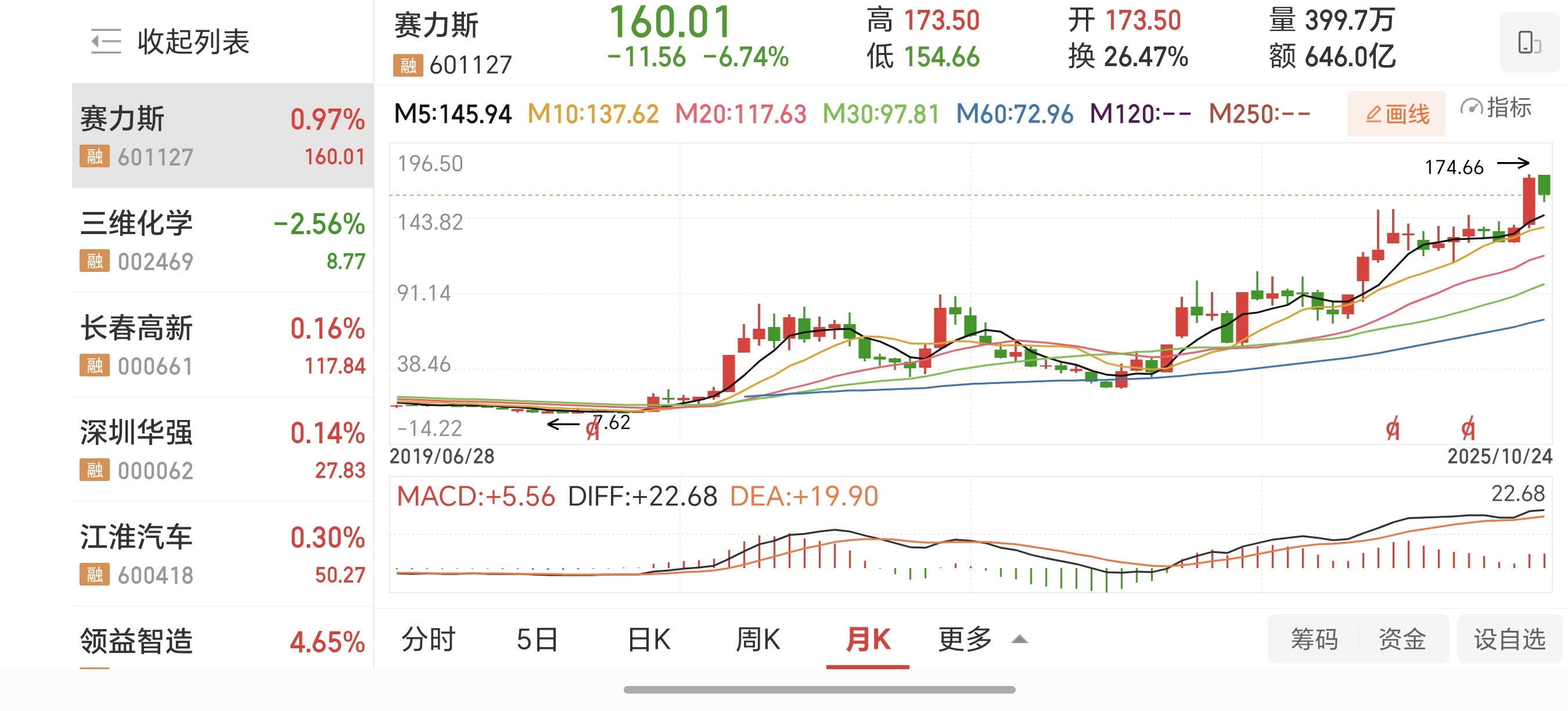 $赛力斯(SH601127)$ 如果这个月收大阴线,月线应该就做顶了,会跌到60月均线(蓝色的线)就像上次月线主前的位置。逻辑就是明年要收增值税,现在已经是高位了大把人看多,明年小米全尺寸suv出来,也会对问界产生压力。