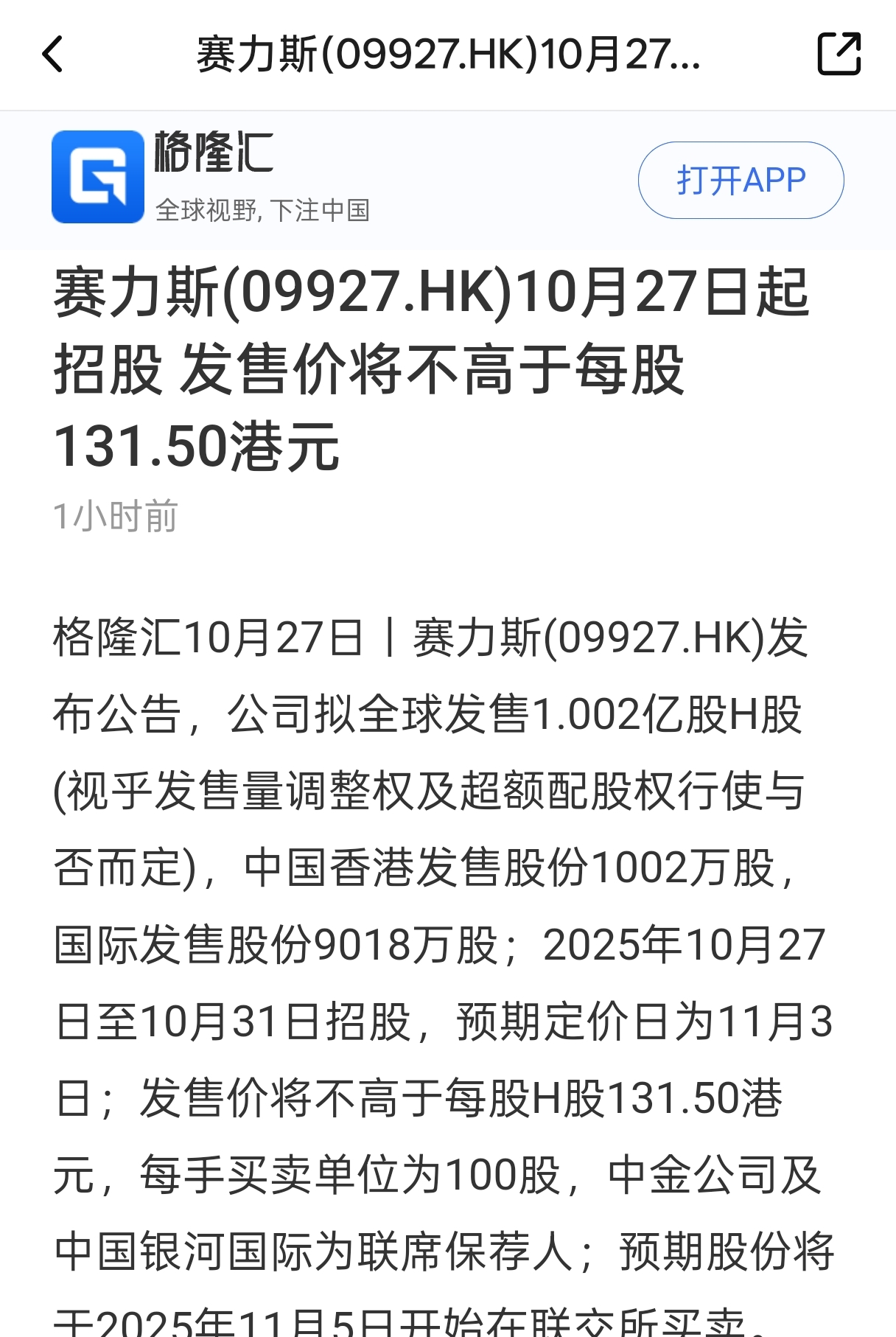 $赛力斯(SH601127)$ 早知道了,具体走势看港股认购火爆程度,如果认购踊跃,会反而提振a股信心,短期波动就无所谓了