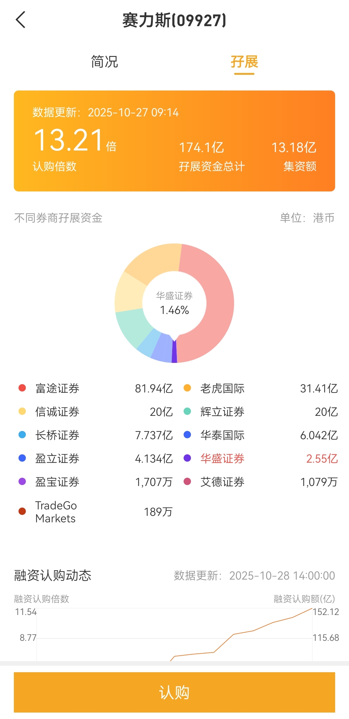 赛力斯第二天港股目前孖展认购倍数13倍。