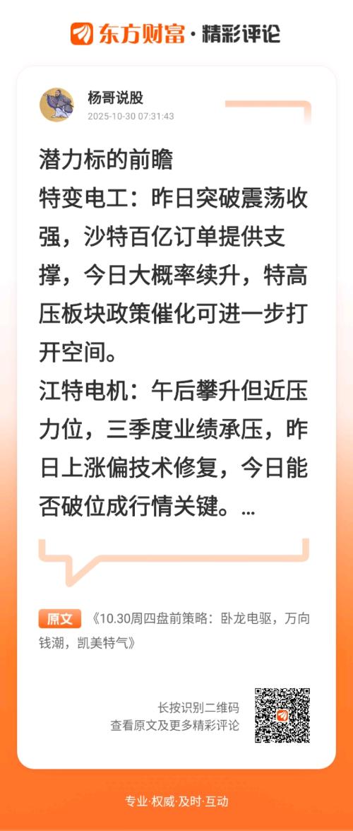 //@杨哥说股 :潜力标的前瞻特变电工:昨日突破震荡收强,沙特百亿订单提供支撑,今日大概率续升,特高压板块政策催化可进一步打开空间。江特电机:午后攀升但近压力位,三季度业绩承压,昨日上涨偏技术修复,今日能否破位成行情关键。英维克:昨日 V 型反弹显低位承接,AI + 储能散热需求托底,守住 75 元支撑则波动或为调整机会,有望冲近期高点。指数与盘面解读指数:昨日站稳 4000 点且量能放超千亿,今日大概率震荡整理,但强势趋势未改,资金或向中小标的扩散,个股补涨机会可期。板块:光伏设备、锂电池昨日领涨,今日有望成核心主线;大科技高位分歧,前期调整板块或迎回流,策略以轮动应对,抓主线与低位补涨。持仓复盘$XD赛力斯(SH601127)$:昨日摆脱震荡大涨,业绩与题材共振,今日大概率续强,新能源赛道回暖可进一步打开空间。卧龙电驱:昨日震荡微跌,今日需修复跌幅重回 50 元上扭颓势,跌破 48.4 元支撑或陷深调。$凯美特气(SZ002549)$:昨日独立攀升站稳成本线,半导体材料赛道有热度,今日稳住支撑或冲击更高位。$万向钱潮(SZ000559)$:昨日震荡显承接,筹码集中、分歧化解,今日破昨日高点大概率续涨,长期可期。