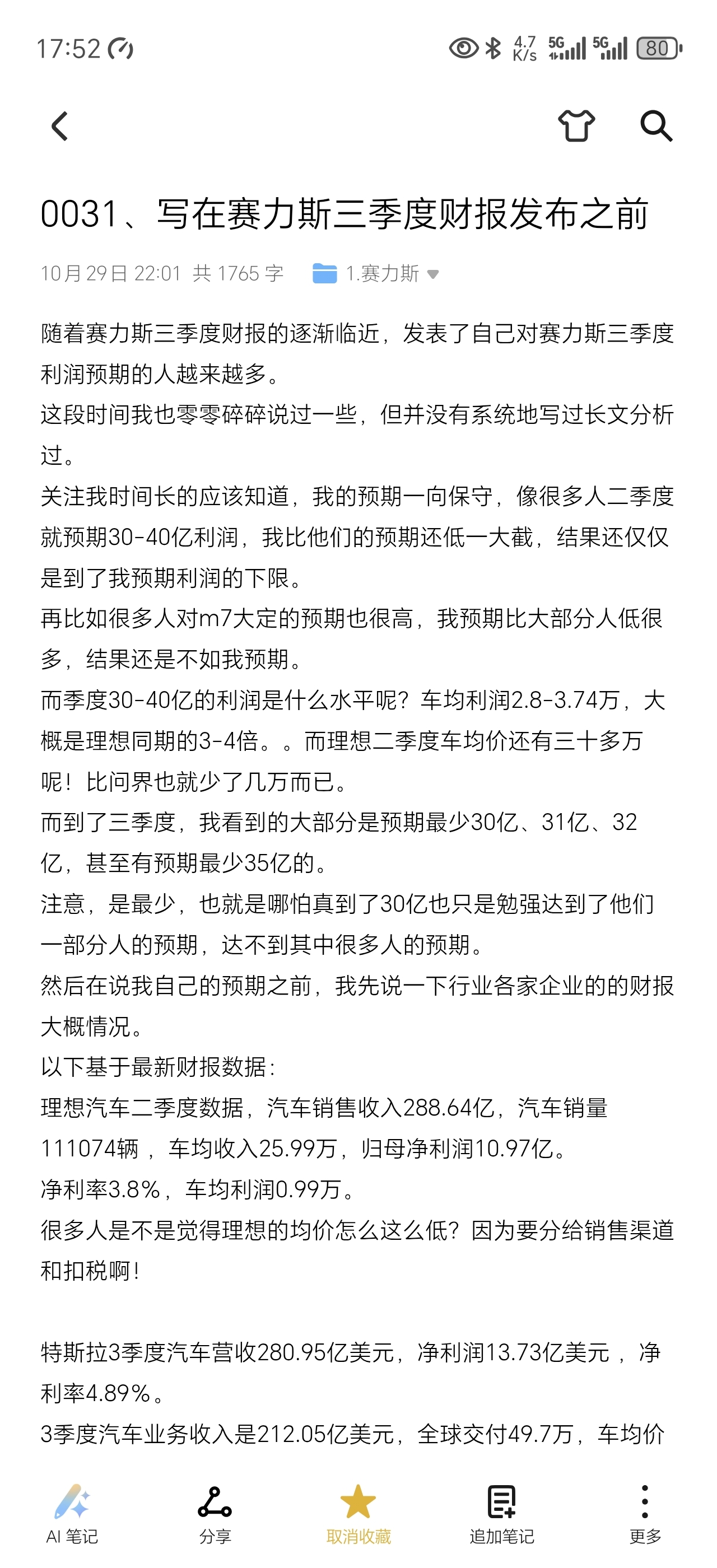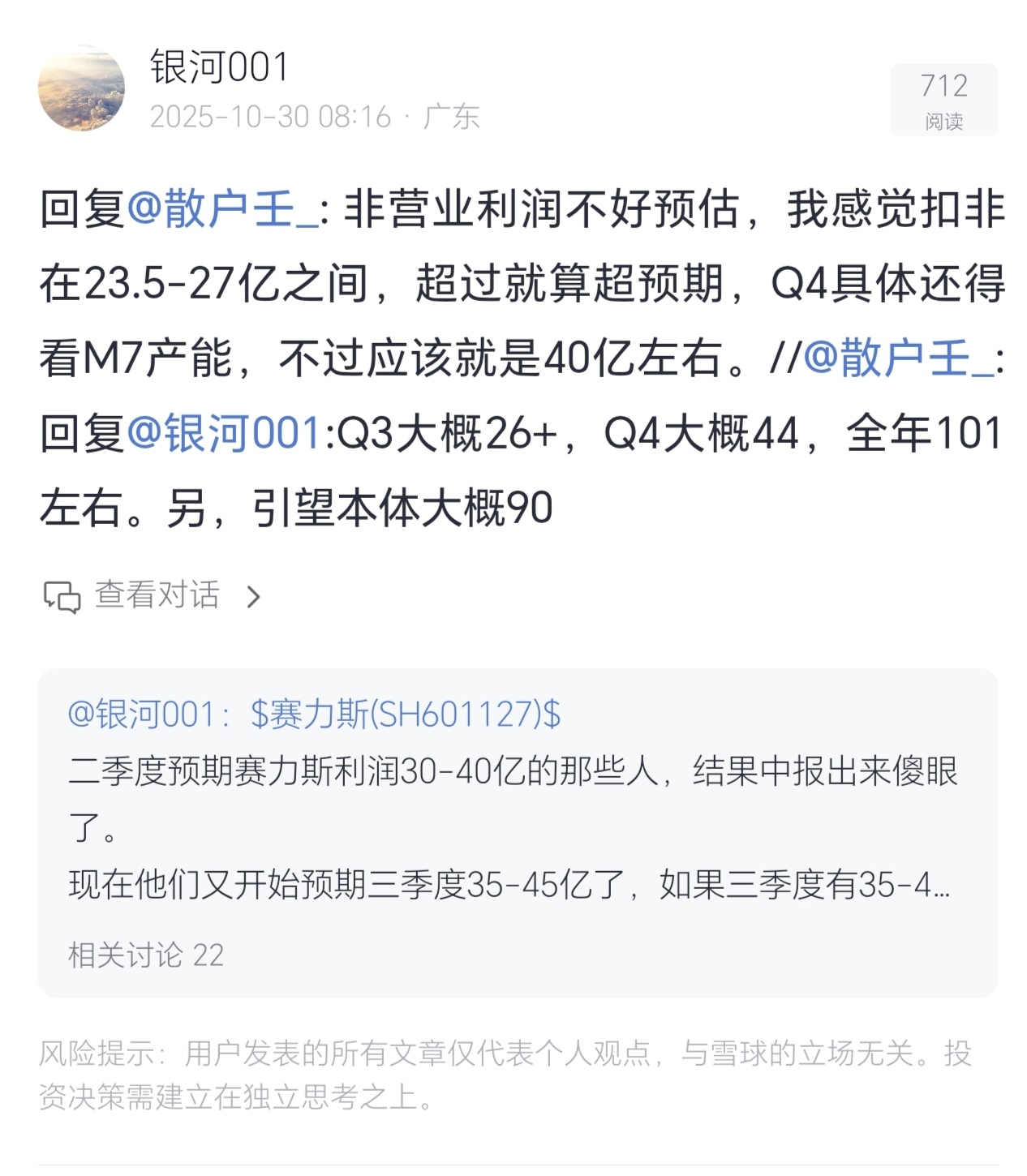 如图所示,9月初时预期当时赛力斯连跌,我预期9月底和10月都会上冲一波,然后10月底季报后可能砸。 现在过了前面两个阶段了,就看明天季报后砸盘与否了。 事实上当时看普遍预期28 就行,然后最近几天看到的普遍就预期最低30 ,甚至有最低35 的。 就看机构怎么想,感觉不会超机构预期,只会低于或者符合。 当然,每一个预期都有相应的价格。 至于我自己而言,只是比我预期范围低了2.5%,感觉还行吧。