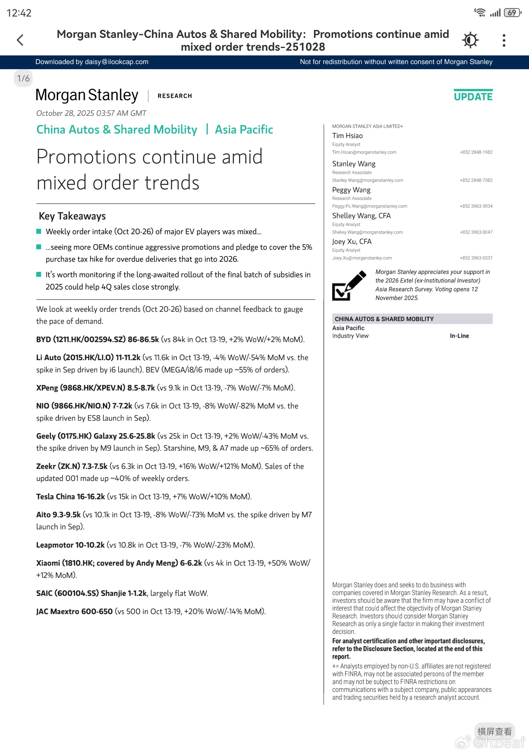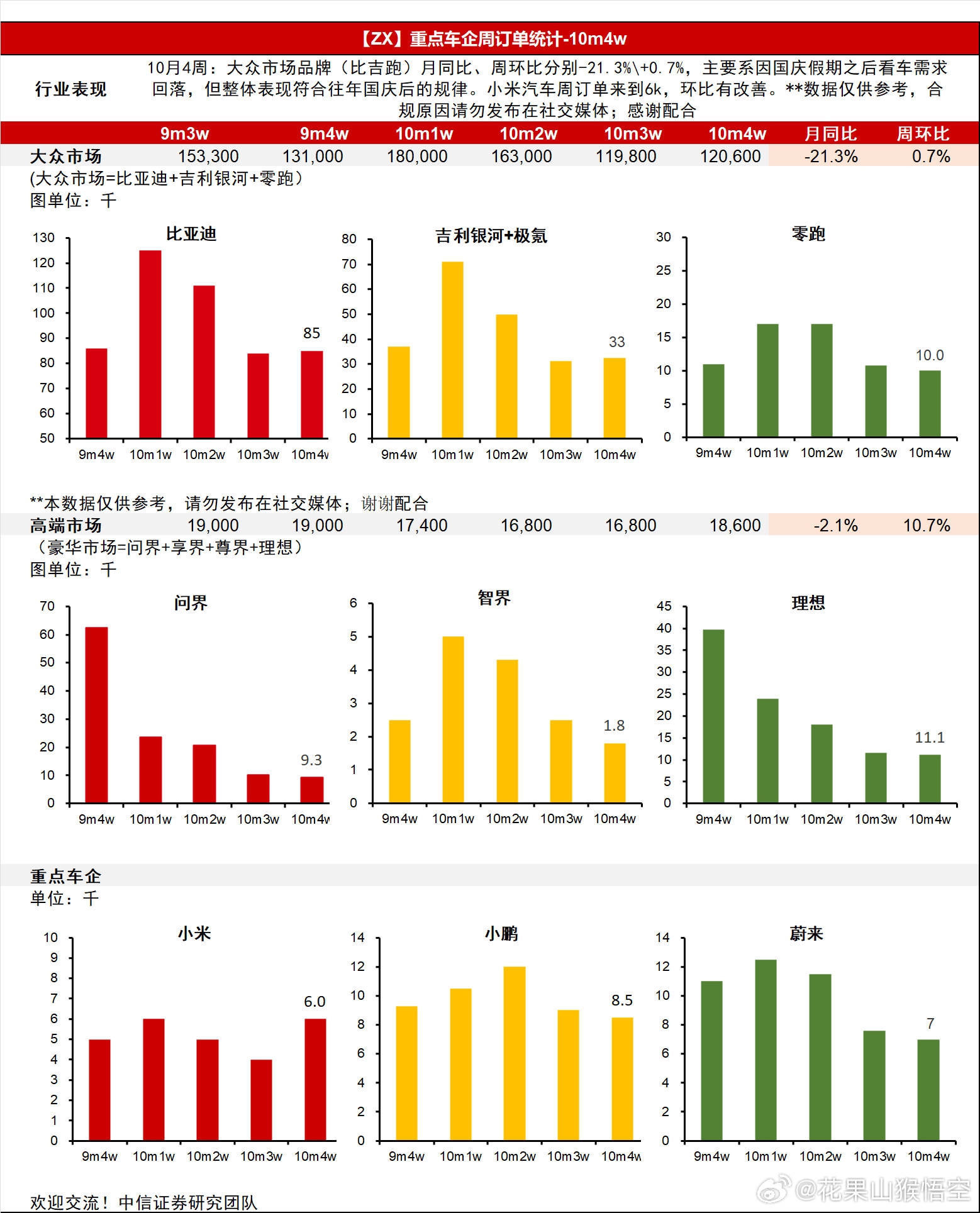 中信最近五周和大摩的上周新能源品牌汽车订单数据,上周的数据中信刚好是大摩的下限。