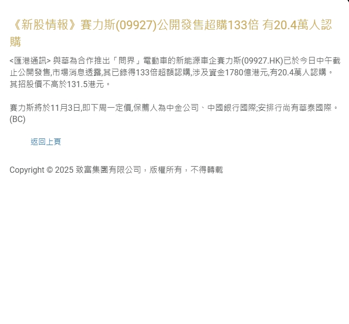 真是服了,香港一堆报道赛力斯招股133倍的新闻,这边还藏着掖着。格局不是一般小。