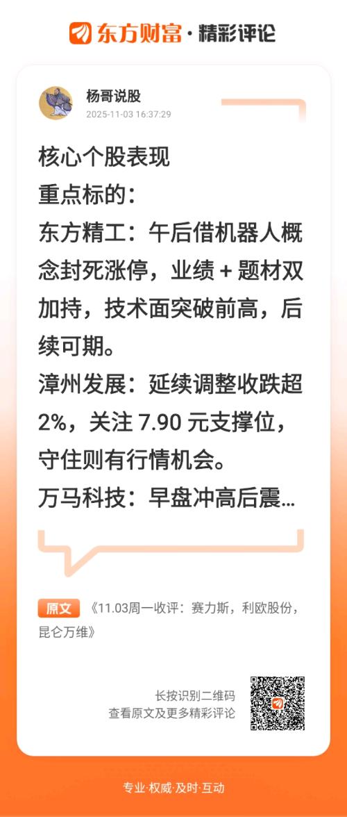 //@杨哥说股 :核心个股表现重点标的:东方精工:午后借机器人概念封死涨停,业绩 + 题材双加持,技术面突破前高,后续可期。漳州发展:延续调整收跌超 2%,关注 7.90 元支撑位,守住则有行情机会。万马科技:早盘冲高后震荡下滑,尾盘微涨 0.17%,处于多头行情回落整理阶段。$赛力斯(SH601127)$:弱势震荡下行,空头占优,观望 152 元支撑位,暂持仓。凯美特气:空头主导股价下砸,量能放大、筹码溃散,暂离场。万向钱潮:多空分歧加剧,早盘冲高后遭空头反扑,先撤离。$昆仑万维(SZ300418)$:全天震荡拉锯,仍处多头趋势,适合高抛低吸,继续持仓。$利欧股份(SZ002131)$:低位震荡企稳,尾盘有承接,已介入,看好后续走势。指数与盘面概况指数:早盘回踩 20 日均线获支撑,午后震荡上行,收盘站上 10 日均线,超 3500 只个股走强,低位标的补涨显著。盘面:缩量背景下先抑后扬,个股涨多跌少。海南自贸区、AI 应用(游戏、文化传媒)、光伏设备表现突出;电池、贵金属、稀土永磁调整居前,市场情绪企稳,后续轮动行情有望延续。