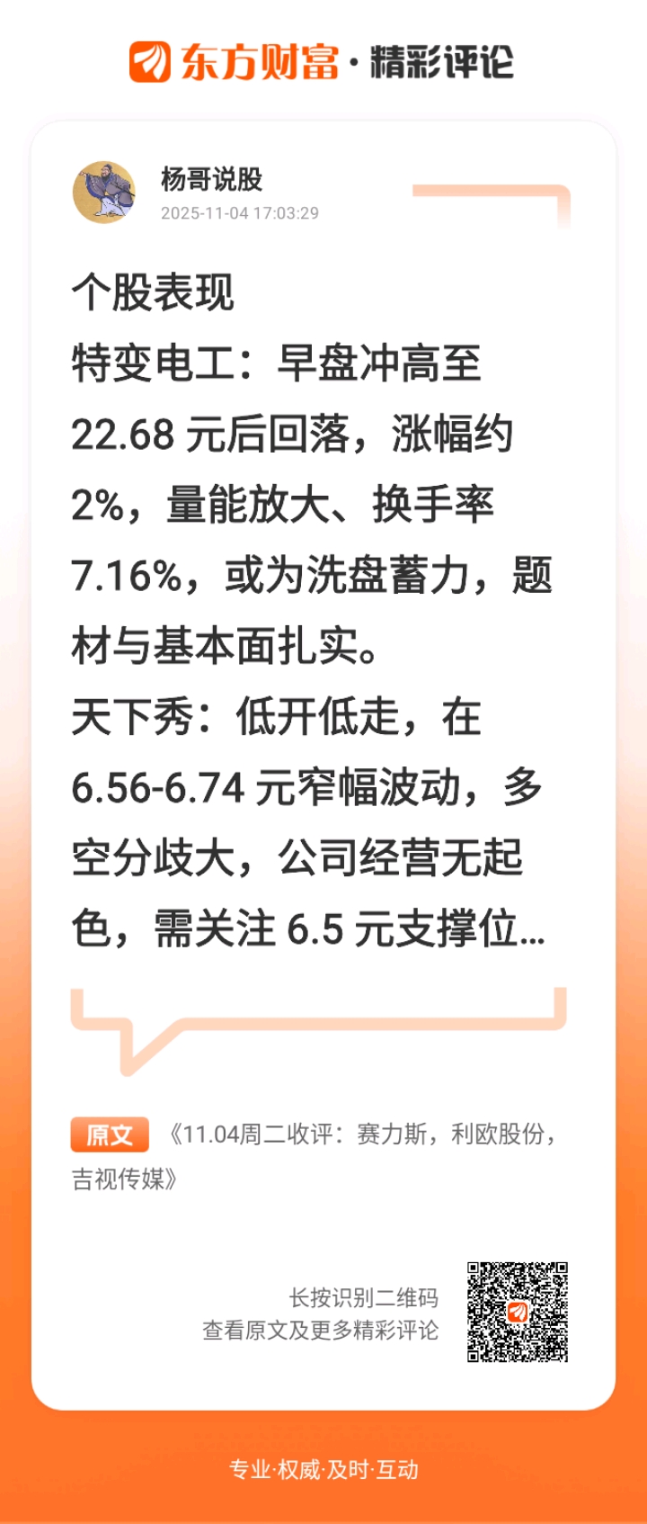 //@杨哥说股 :个股表现特变电工:早盘冲高至 22.68 元后回落,涨幅约 2%,量能放大、换手率 7.16%,或为洗盘蓄力,题材与基本面扎实。天下秀:低开低走,在 6.56-6.74 元窄幅波动,多空分歧大,公司经营无起色,需关注 6.5 元支撑位。常山北明:早盘借鸿蒙概念冲高近 24 元,午后随大盘回落至 23.7 元附近微涨,量能未有效放大,暂处震荡。$赛力斯(SH601127)$:午后发力,震荡上行,多头占优,华为智选车优势显著,量能稳定则有望延续涨势。昆仑万维:早盘冲高后午后回落,筹码分散、量能减少,需观察后续量能与板块联动。$利欧股份(SZ002131)$:窄幅震荡,多空博弈,短期或持续整理,量能放大有望突破。$吉视传媒(SH601929)$:早盘探底后午后回升,尾盘封涨停,量能大增、封单稳固,早盘已介入。指数与盘面指数:A 股集体调整,沪指抗跌,深成指、创业板指调整幅度大,市场交投活跃度下降,此为阶段性休整,缩量意味着抛压有限,后续有望震荡回暖。板块:福建本地股领涨(近 20 股涨停),冰雪产业、电网设备、银行等板块走强;有色金属、黄金、减肥药、机器人等板块回调,多为前期高位标的。