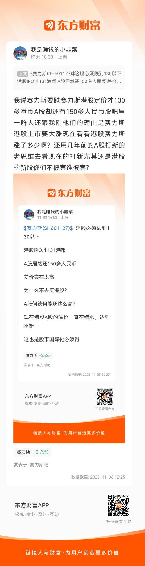 维持这个观点不变但凡有点正常思维的散户都不会在这个位置看涨赛力斯港股是个风向标外资绝对比内资要有良知//@我是赚钱的小韭菜 :我说赛力斯要跌赛力斯港股定价才130多港币A股却还有150多人民币股吧里一群人还跟我刚他们的理由是赛力斯港股上市要大涨现在看看港股赛力斯涨了多少啊?还用几年前的A股打新的老思维去看现在的打新尤其还是港股的新股你们不被套谁被套?