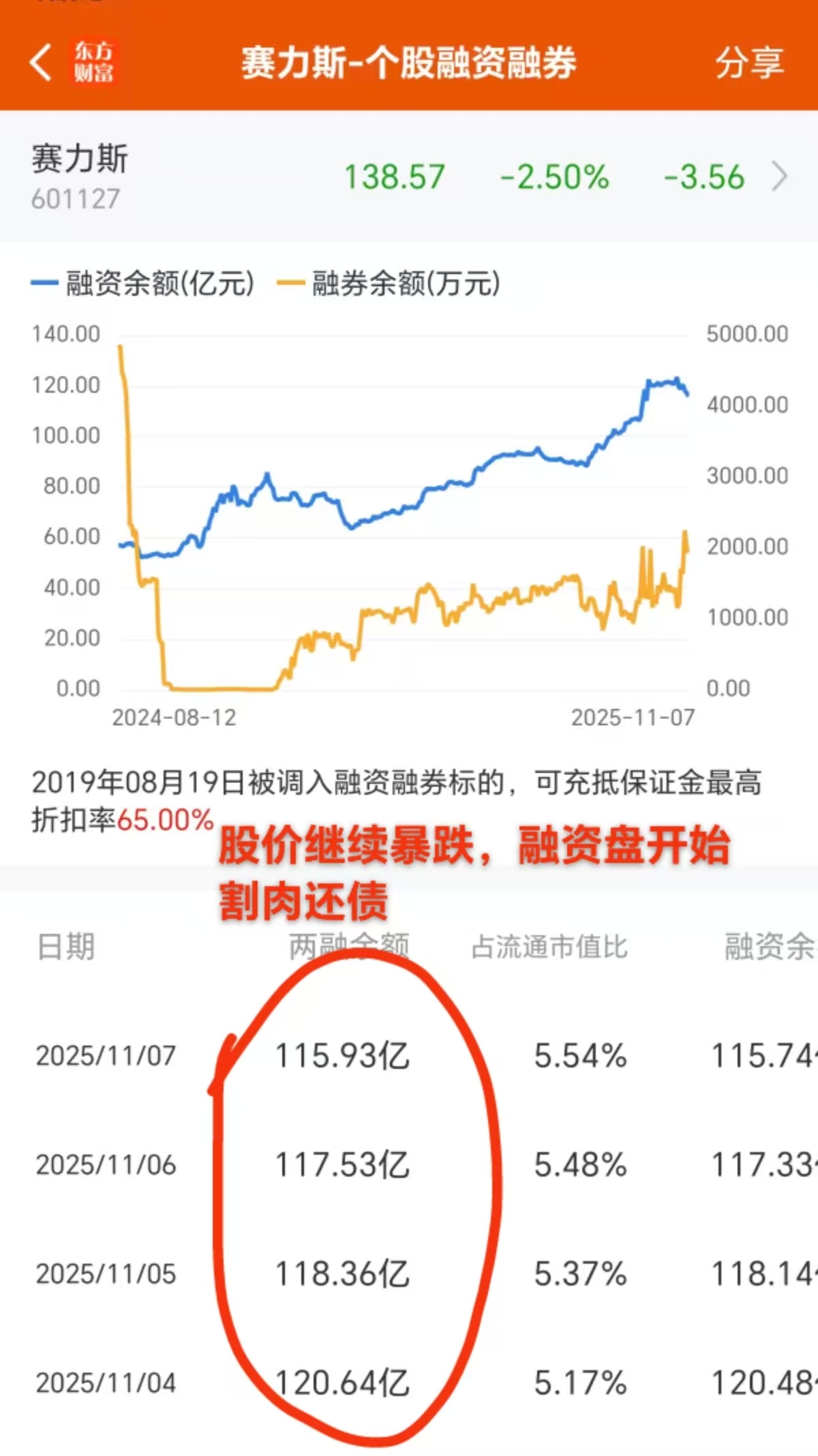 $赛力斯(SH601127)$ 股价一直在狂跌,好像开始割到融资盘了,两融余额越来越少了,说明融资盘开始陆续割肉还款了,这算是好事还是坏事?