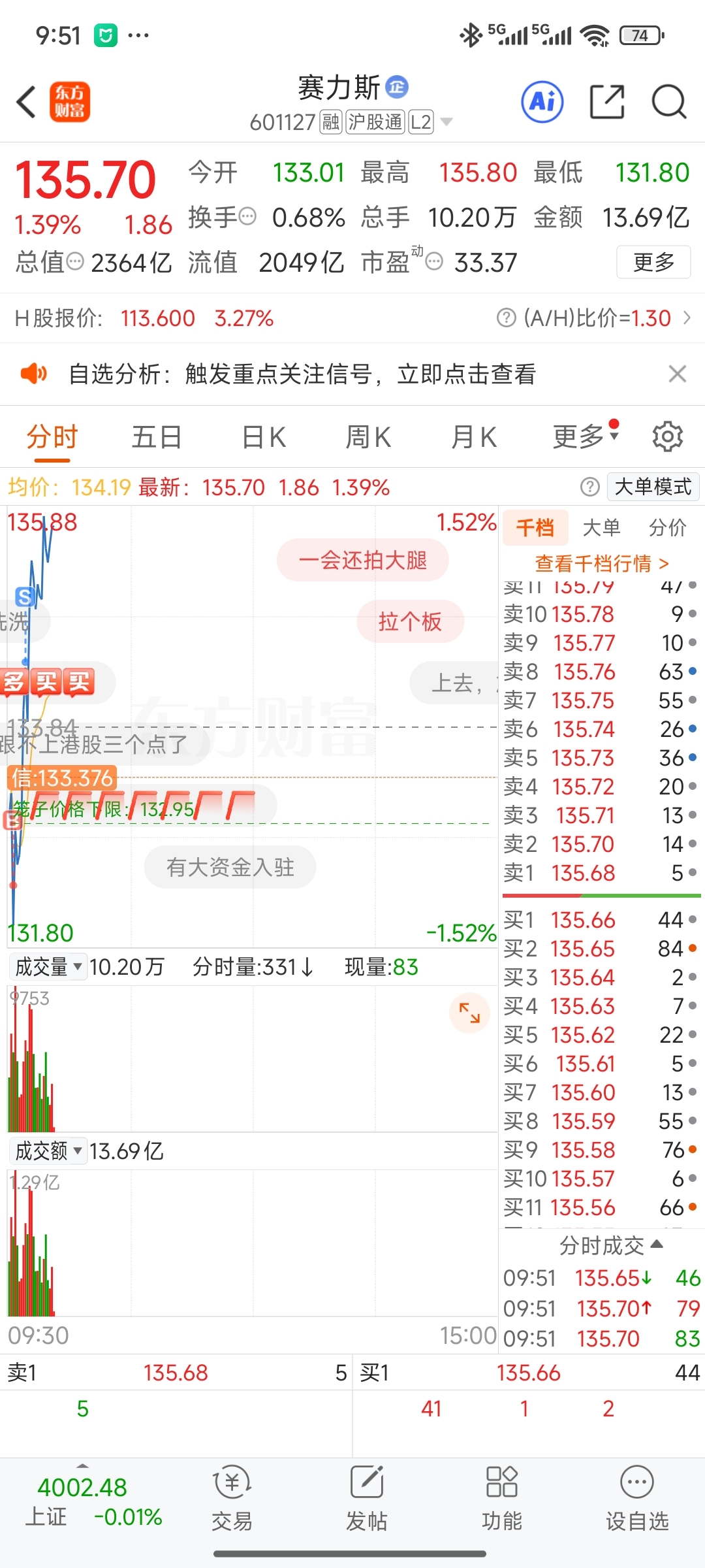 $赛力斯(SH601127)$ 132.22入,134.44出,看来T早了