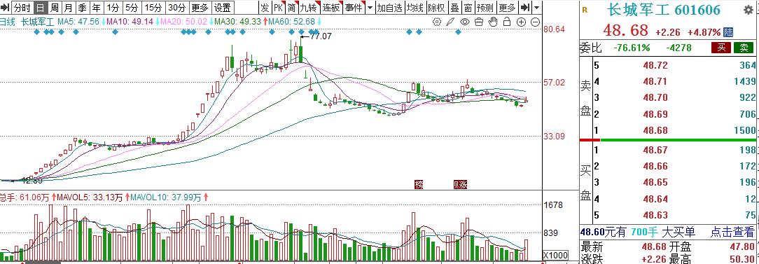 已经是第四次看好它了,前面三次都是成功把握到了一波行情。它的关注度一直都是比较高的,在军工股中辨识度最高。近日小日子对弯弯的言论引发了一系列反应,周边气氛紧张。周五军工就明显有异动,北方长龙热门股都是明显走强。长城军工是中兵集团旗下,主营做迫击炮,单兵火箭等装备,在常规武器和信息化弹药领域在行业是领先,旗下四家子公司都是国内重点军工企业,可见行业影响力很大。