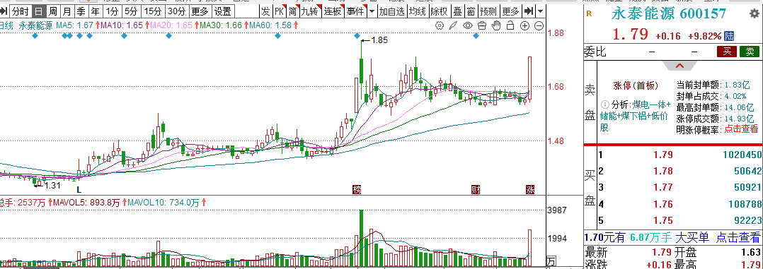 公司主营电力和煤炭,这个票基本面其实没有太多亮点,之所以还是看好它,主要它是煤炭里的低价股。进入冬季北方已经开始大量需要供暖,为什么最近天然气板块上涨就是因为进入冬季燃气和煤炭都有一波行情。其实前期煤炭已经有异动了,短线燃气板块上涨也会带动煤炭再次异动。永泰基本面并不是很差,公司还是保持正常盈利。盘子也不大,但股价才一块多,明显是被低估了。