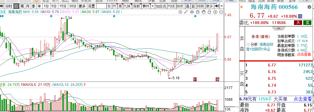 技术上看,它在今年上半年走势也是非常活跃了,经常拉出了涨停板。周五早盘在医药和海南板块中都是最先冲击涨停,能否成为下一个海马汽车呢?还是很有希望的。早盘集合竞价会是高开,若幅度不是太大开盘就可以研究了。