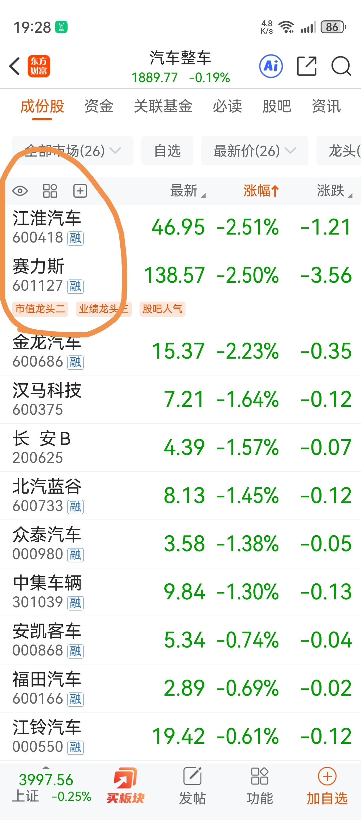 $赛力斯(SH601127)$ $江淮汽车(SH600418)$ 跌的时候一起当板块倒数第一第二,你爷爷江淮涨的时候,你不跟了?