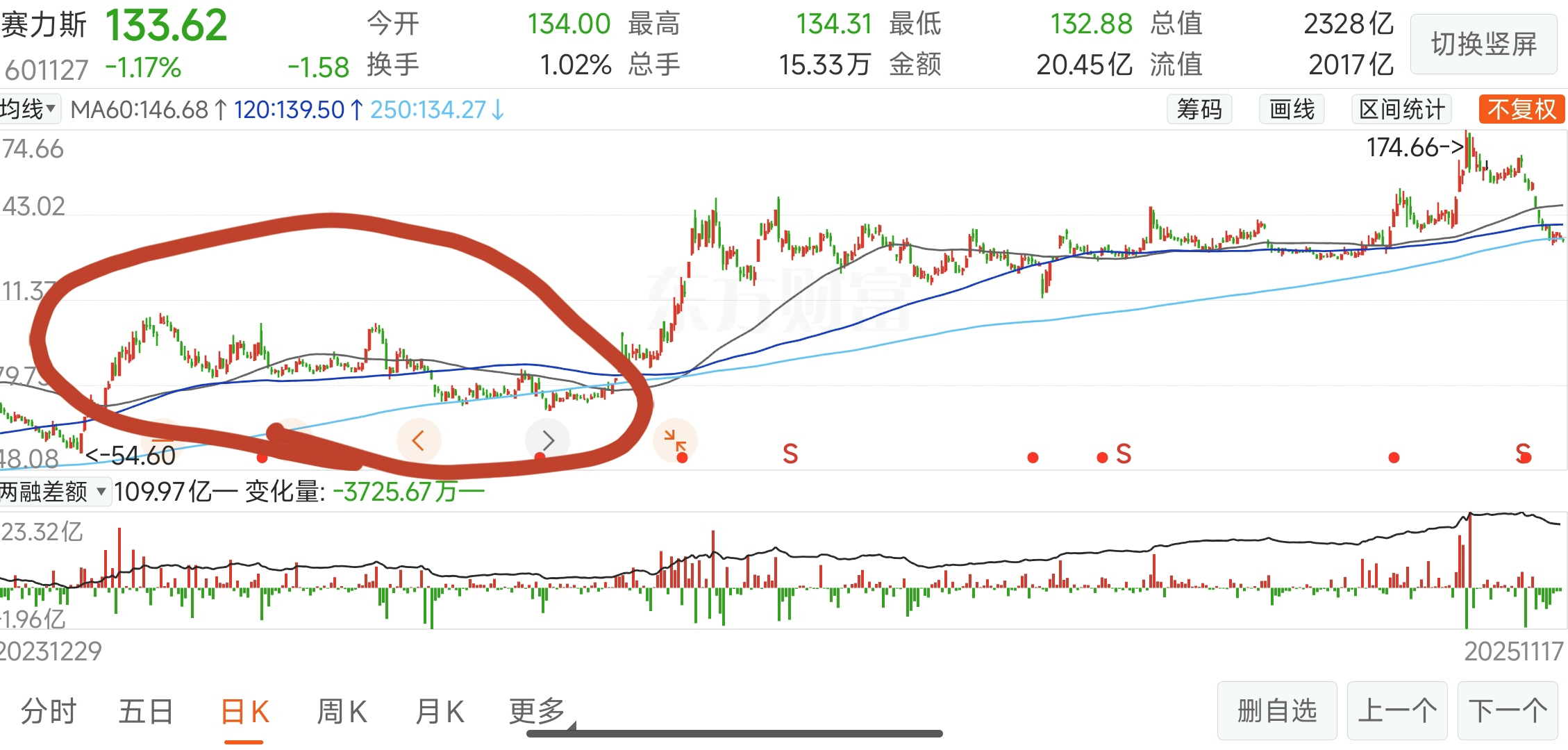 $赛力斯(SH601127)$ 跳空跌破年线撒,正式转熊,跳空破年线,三五个月必到上一个平台做支撑撒!80-100左右!