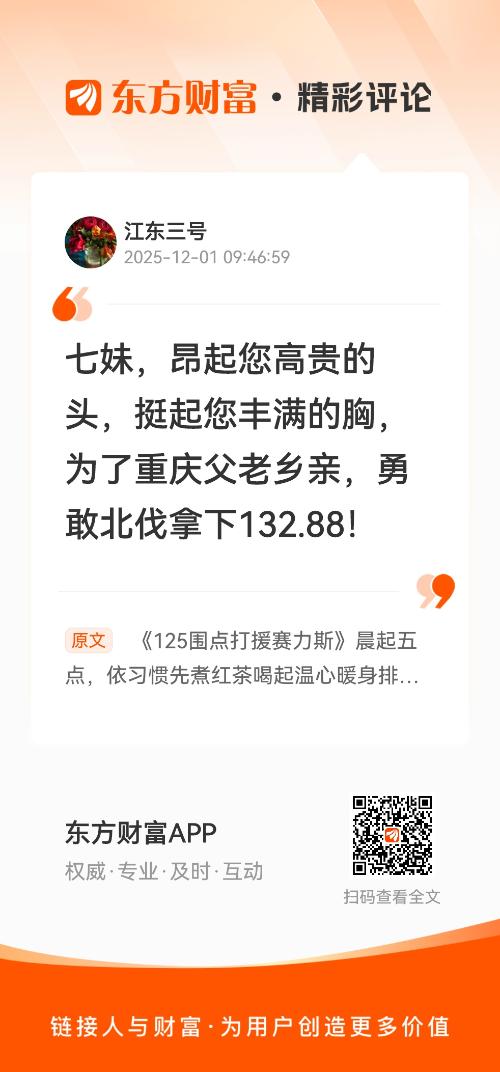 《125围点打援赛力斯》晨起五点,依习惯先煮红茶喝起温心暖身排宿毒补水分,玩股票的人多喝红茶少品绿茶,我们看绿色己经许多许多,股市和个股经常绿,一年四季股市和个股有四分之三是绿色苍茫,乱云飞渡!昨天四部门又出了促进大消费方面的政策利好,时近辞25旧岁迎26新年之际,房企、酒企、车企、大众日用品、生活必需品也应该火一把了,问题是钱从何处来?股市上套着许多想消费敢消费的人,如果能解套和赢点钱也许无须动员和刺激,谁都会自觉消费。把股市搞上去,让大部分散户赚到钱才是硬道理。今天星期四,七妹正常情况会上窜下跳逗人玩,她生产的东西不是普通收入者人人买得起的,所以四部门出台的消费政策对她有促醒作用而无百益!七妹有其优势,但是机构只抱团捧红五妹阳光不炒七妹,这个重庆妹妹是红不起来的,只能静守岁月,耐心等待风飞时机!围点打援吧,用四成仓位围住七妹的125元,抽二成资金打去打野,留四成资金做预备队,挣点钱带着外孙和孙子去消费!