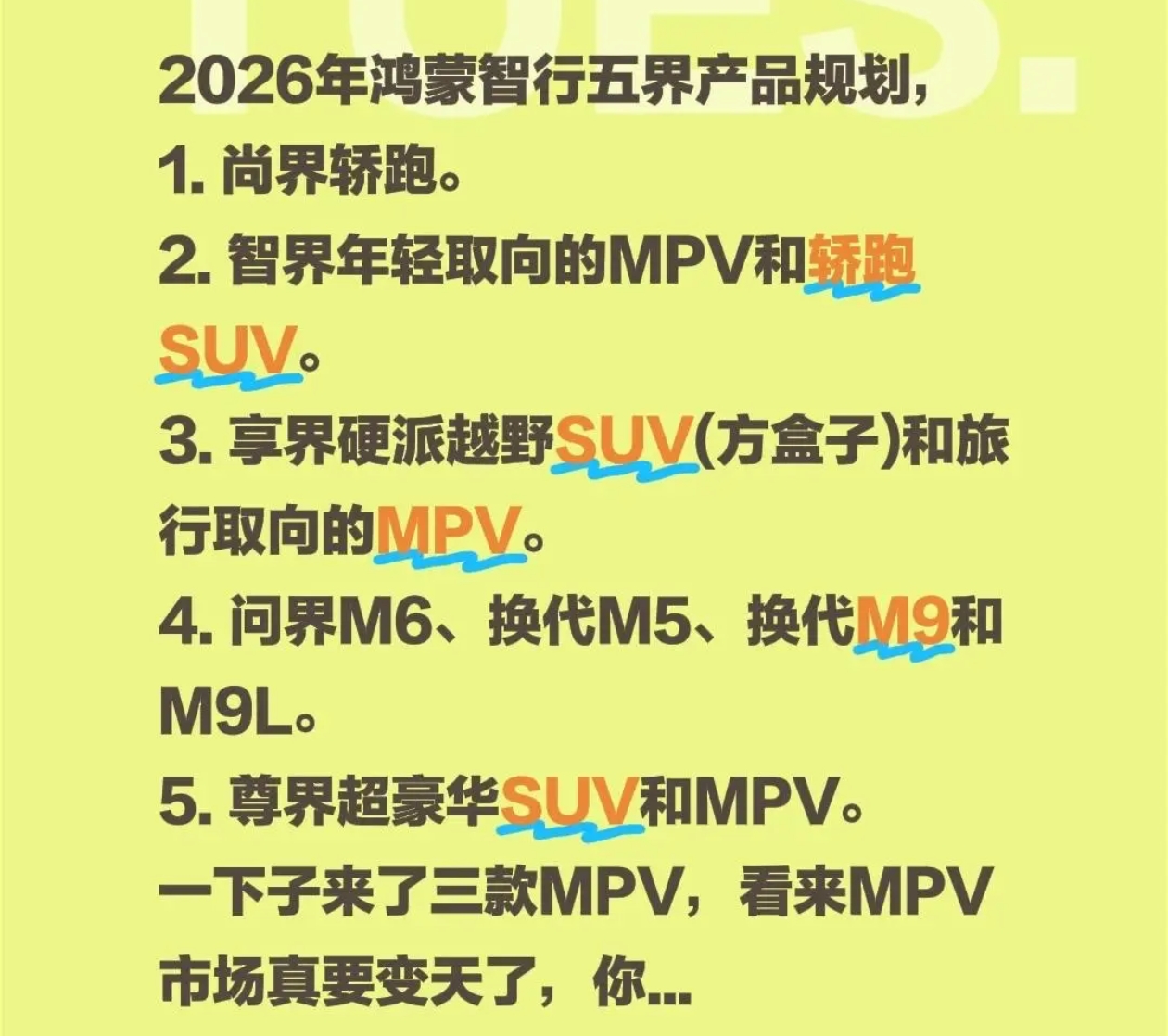 明年除了赛力斯全都有新车型,而且轿车,suv,越野都有了,赛力斯还是只能在几个s