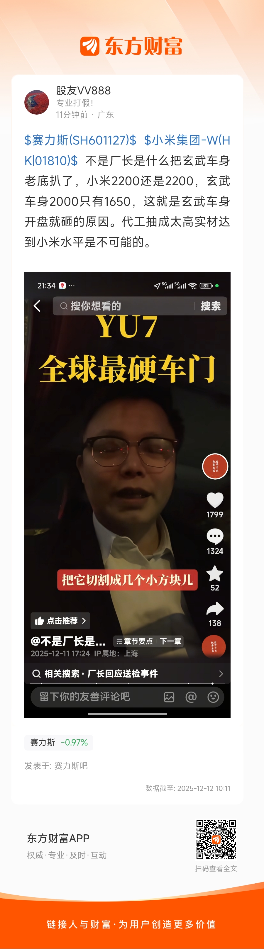 $赛力斯(SH601127)$ $小米集团-W(HK|01810)$ 不是厂长是什么把玄武车身老底扒了,小米2200还是2200,玄武车身2000只有1650,这就是玄武车身开盘就砸的原因。代工抽成太高实材达到小米水平是不可能的。