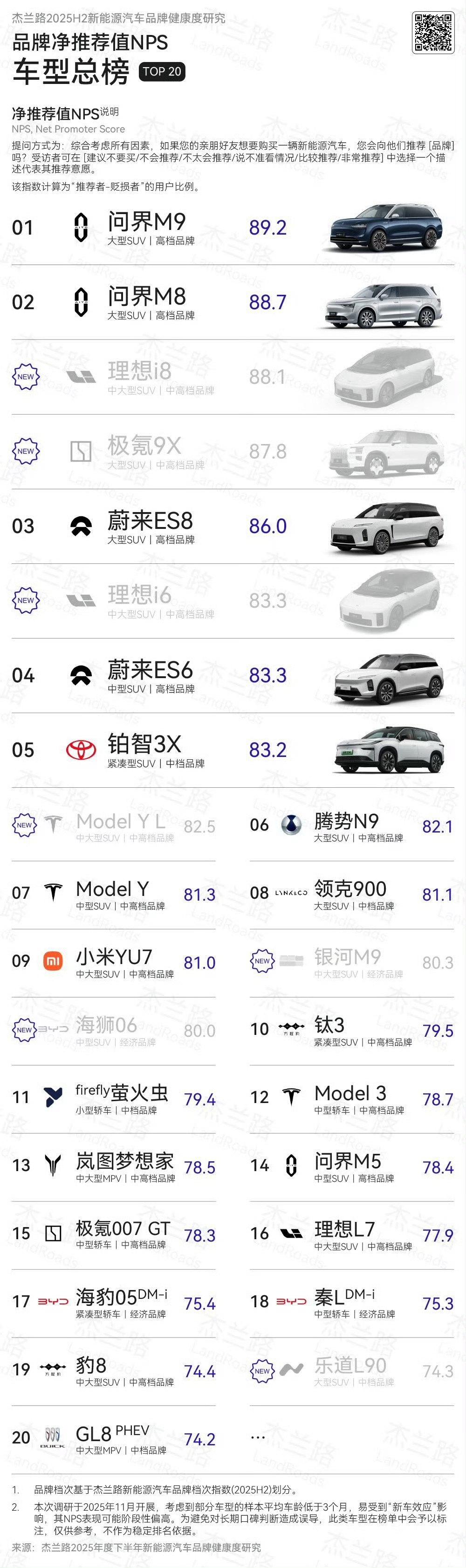 去年净推荐值第一名的车型是问界M9,今年第一名问界M9,第二名问界M8,预估明年