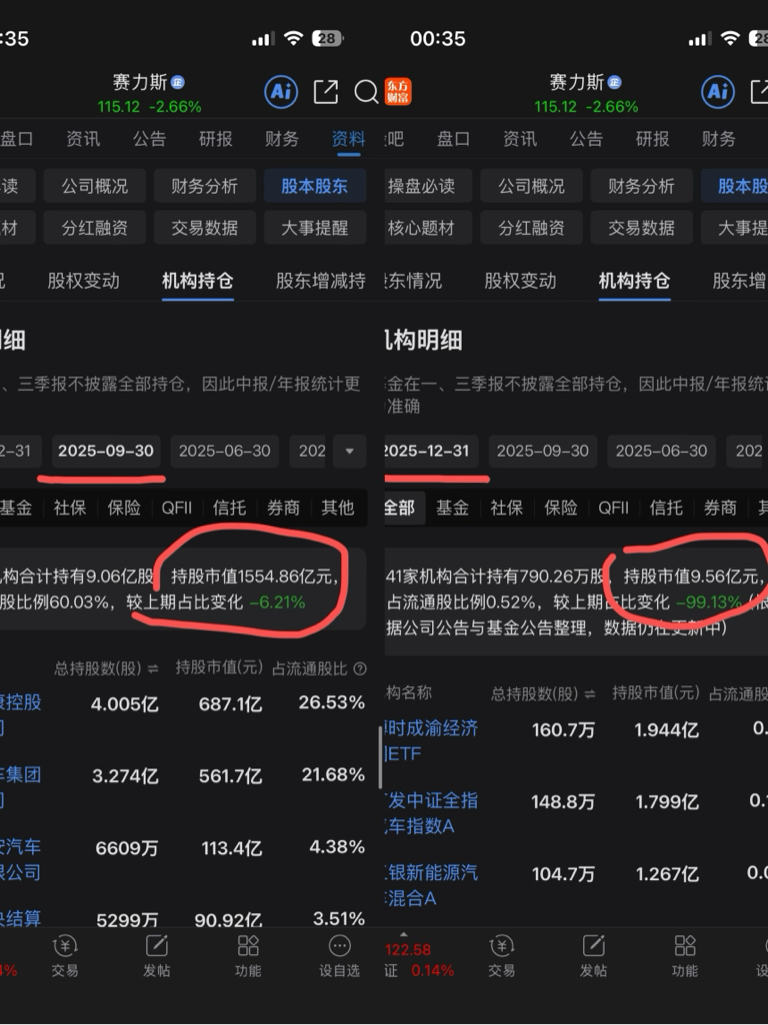 $赛力斯(SH601127)$ 赛力斯彻底已经被主力机构抛弃了,从机构持股1500多亿到现在剩9个亿 市值这么大 机构都不买 怎么涨?估计就是反复震荡下跌吧