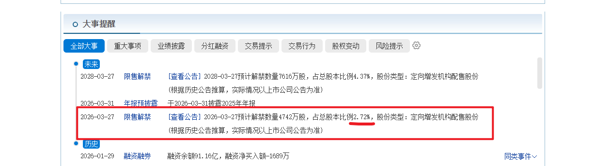 你们看下解禁,3月27日接近3%的解禁,是福是祸不好判断,可能持股人有信心不抛售就不会跌,也可能大抛大跌,不要在刀口上舔血啊。