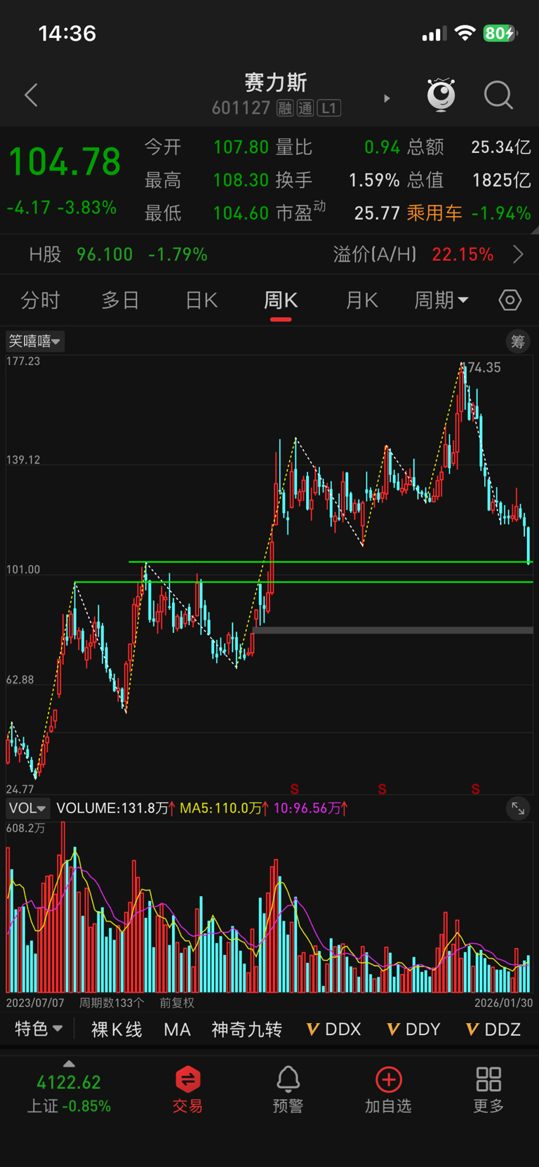 $赛力斯(SH601127)$ 今日与周一在98.36-105.05之间买入,博弈周二反弹。绿线以下止损。