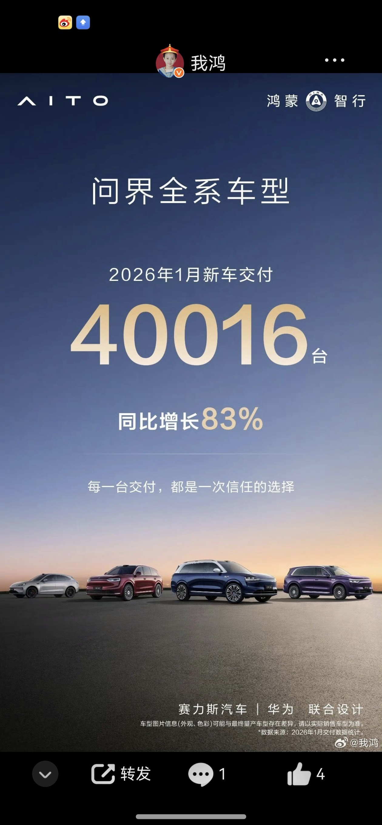 问界汽车一月份销量40016台.同比增长83%!