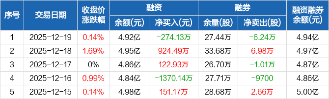 常熟银行融资融券信息显示,2025年12月19日融资净偿还274.13万元;融资余额4.92亿元,较前一日下降0.55%。
