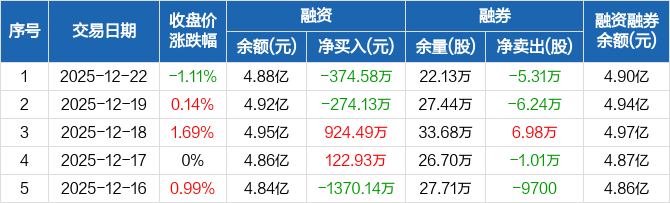 常熟银行:融资净偿还374.58万元,融资余额4.88亿元(12-22)