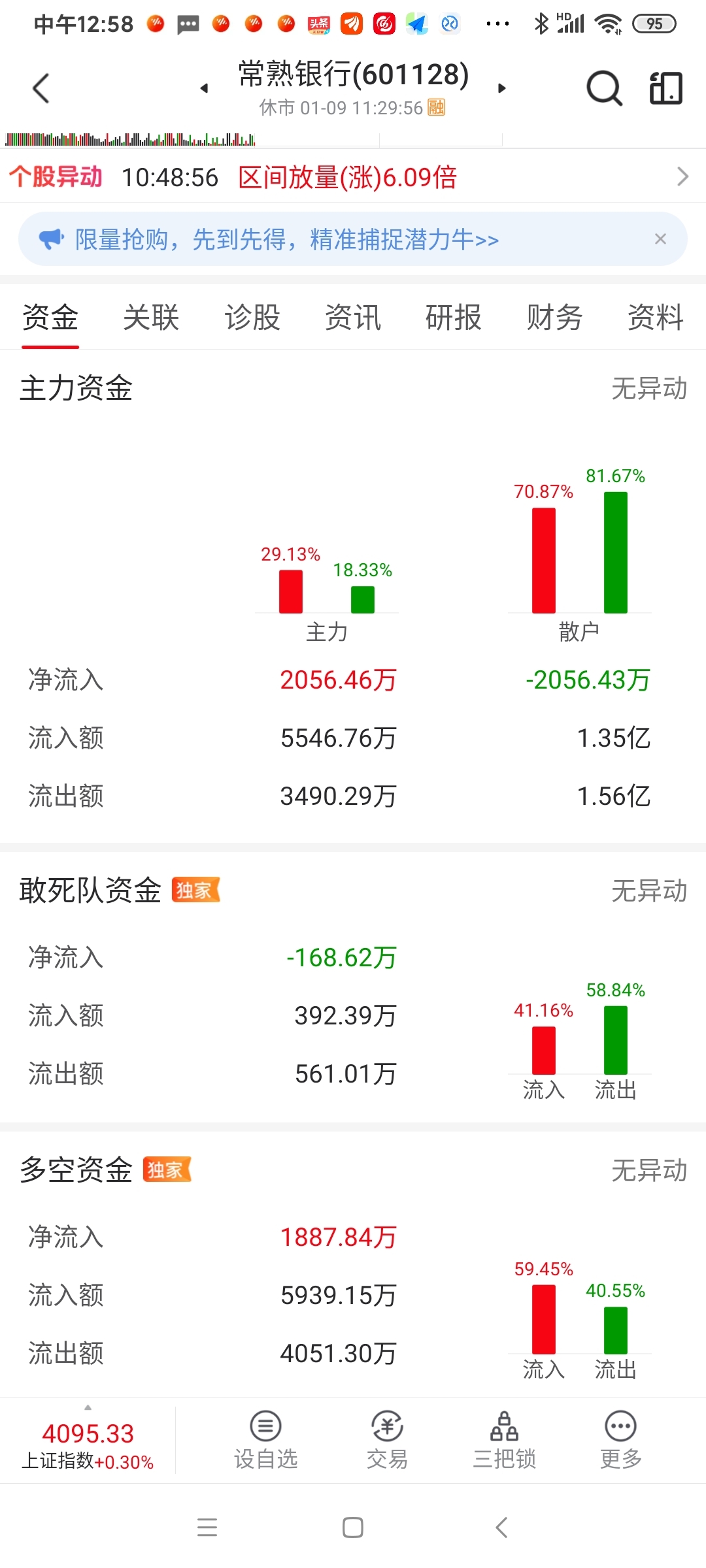 早上常熟银行银行板块排名第三早上主力资金净流入2056万元早上多空资金净流入18