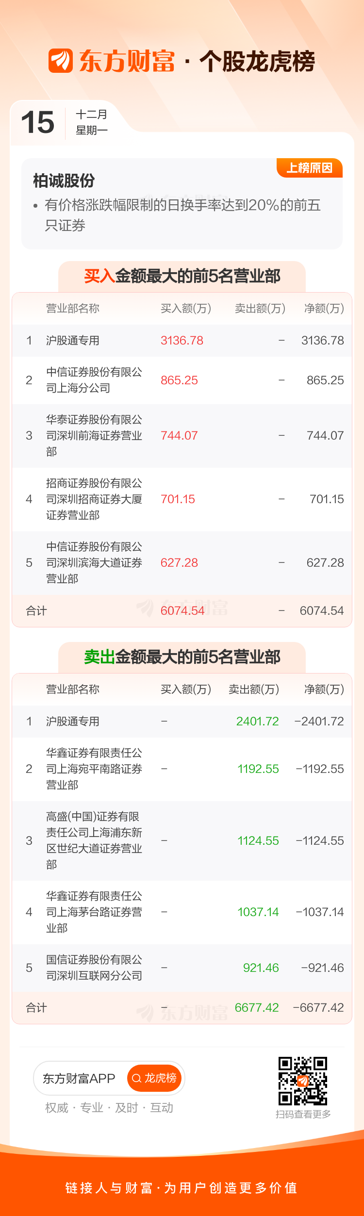 交易所2025年12月15日公布的交易公开信息显示,柏诚股份因成为有价格涨跌幅限制的日换手率达到20%的前五只证券上榜。柏诚股份当日收报14.64元,涨跌幅-2.40%,偏离值25.24%,换手率25.24%,成交额5.65亿。