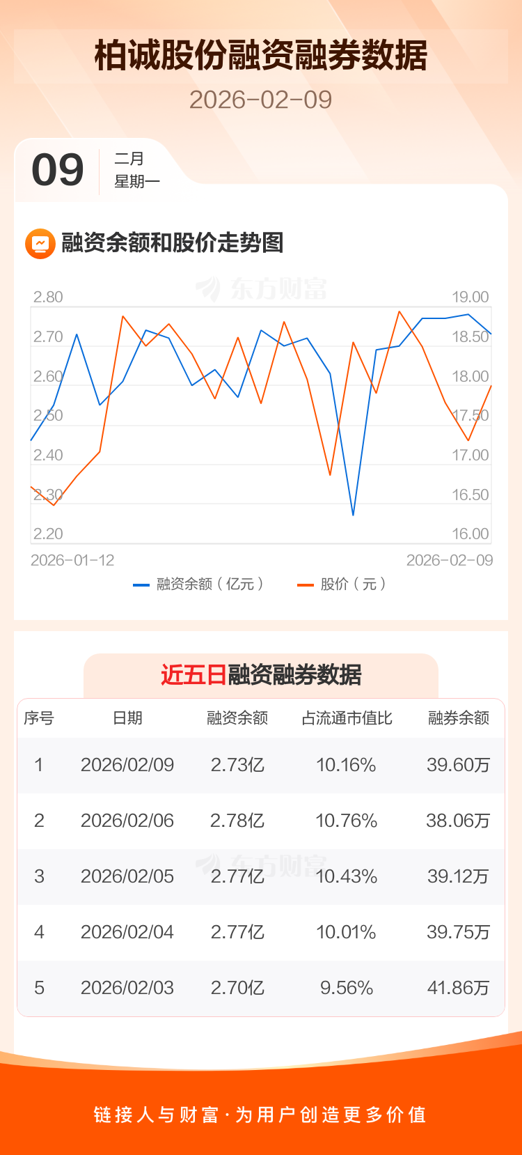 交易所最新数据显示,柏诚股份于2026年2月9日获融资买入3345.99万元,融资偿还3837.03万元,当日融资净偿还491.04万元。目前,该股融资余额2.73亿,占流通市值比例为10.16%。