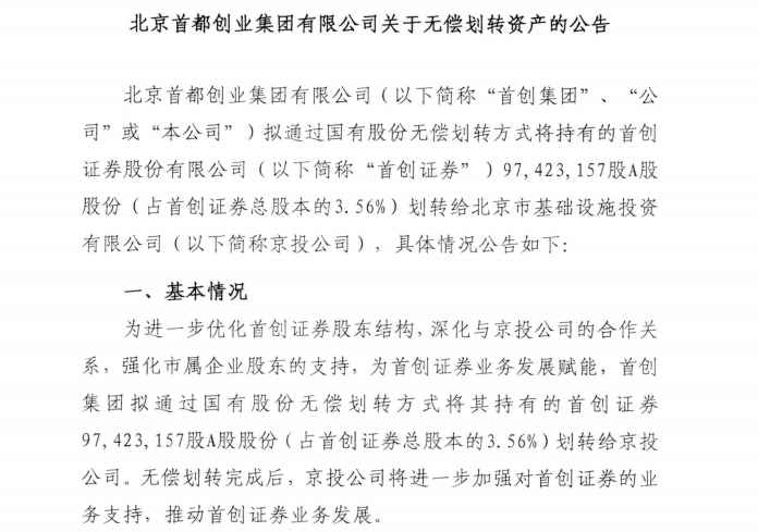 10月15日,北京首都创业集团有限公司(简称首创集团)拟通过国有股份无偿划转方式,将其持有的首创证券9742.316万股A股股份(占首创证券总股本的3.56%)划转给北京市基础设施投资有限公司(简称京投公司)。
