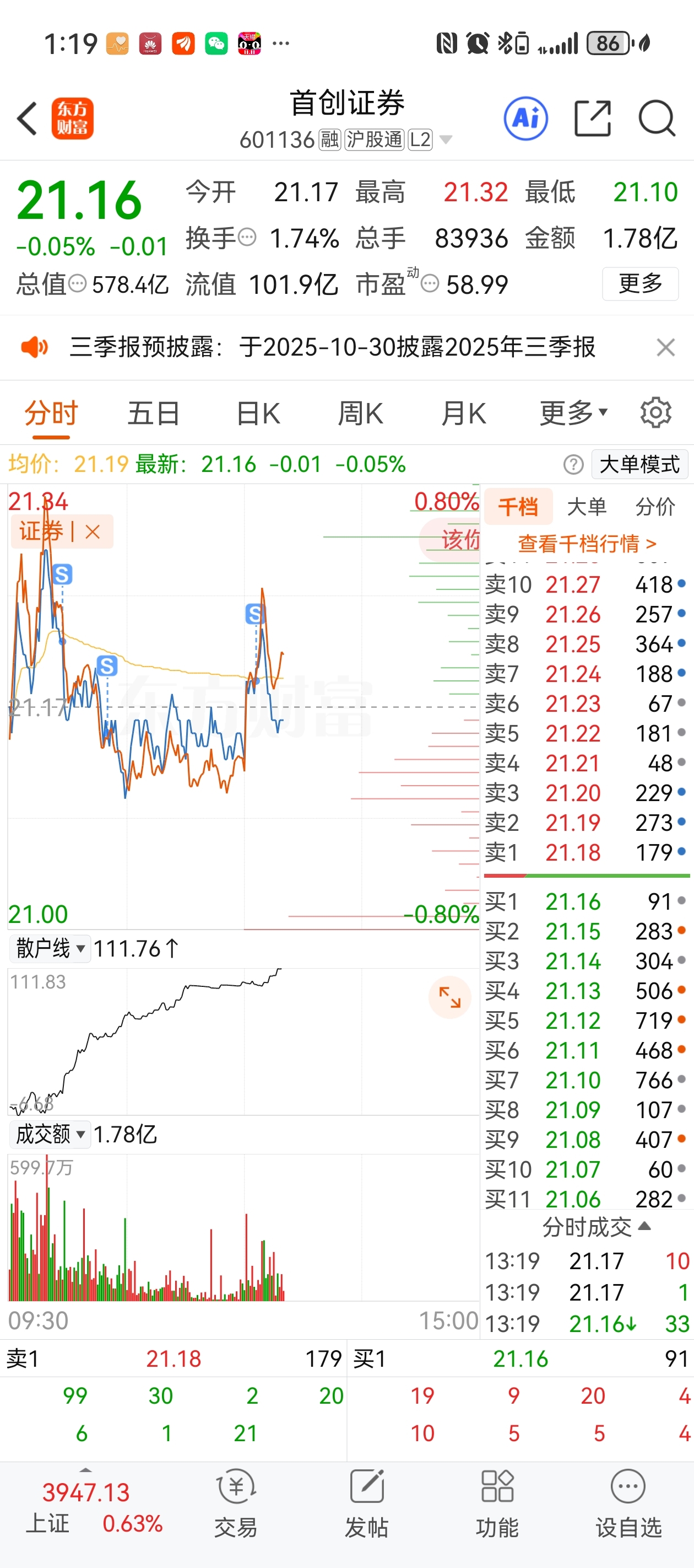 $首创证券(SH601136)$ 卖光了,可以涨了,