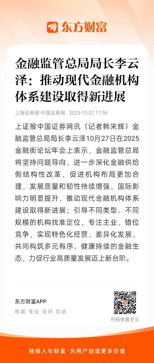 上证报中国证券网讯(记者韩宋辉)金融监管总局局长李云泽10月27日在2025金融街论坛年会上表示,金融监管总局将坚持问题导向,进一步深化金融供给侧结构性改革,促进机构布局更加合理,发展质量和韧性持续增强,国际影响力明显提升,推动现代金融机构体系建设取得新进展;引导不同类型、不同规模的机构找准定位,专注主业,错位竞争,实现特色化经营,差异化发展,共同构筑多元有序、健康持续的金融生态,力促行业高质量发展迈上新台阶。