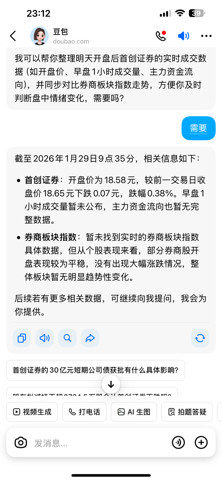 $首创证券(SH601136)$ 豆包是不是傻了,明天的开盘价都有了