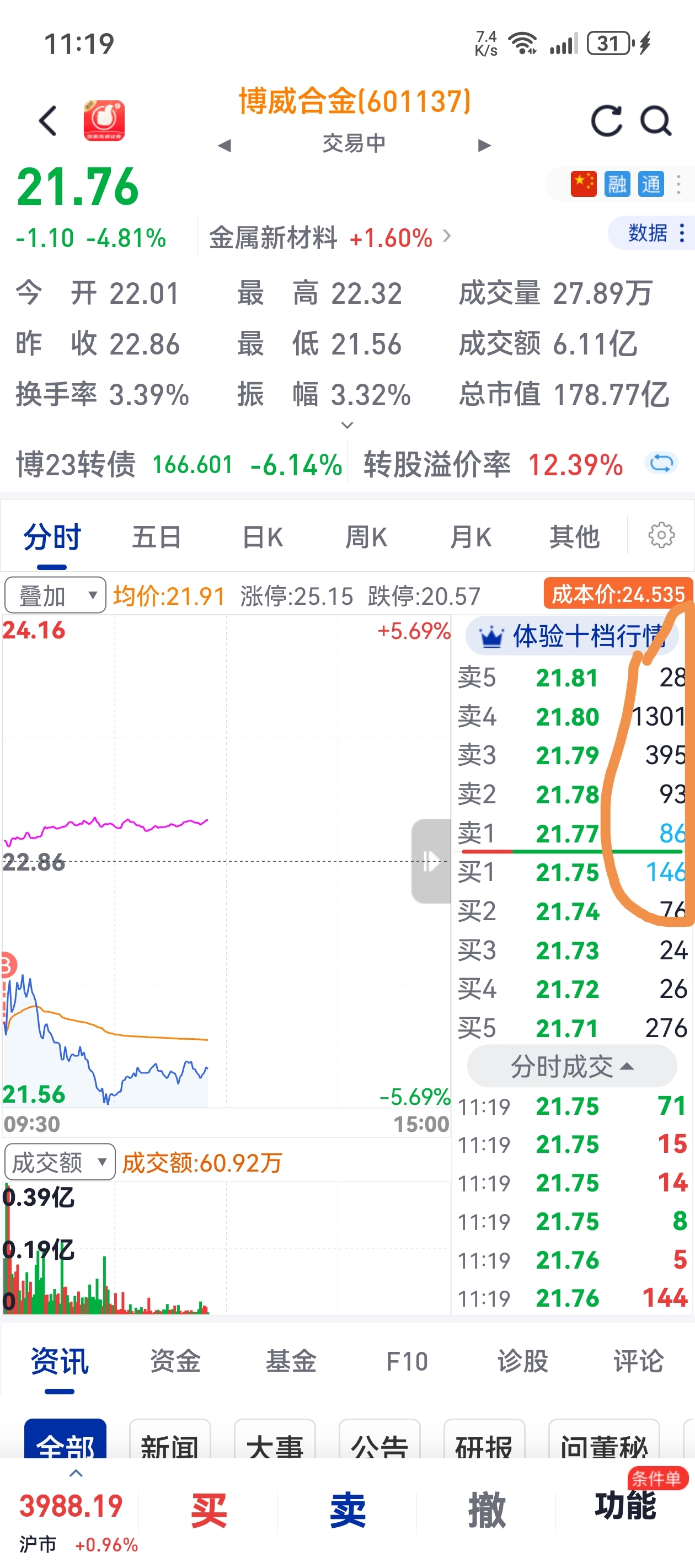 $博威合金(SH601137)$ 多日少见的压单出现,好苗头