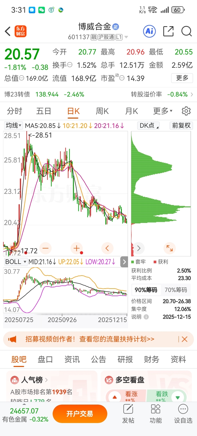 $博威合金(SH601137)$ 一年营业收入200多亿净利润12亿多的大好上市公司,竟然走了一波这样的行情。长盛轴承一年营业收入10多亿的也有200多亿总市值,博威合金竟然160多亿总市值。这庄家家里生产压缩机的吗?还是这里的散户都是老鼠转世的?