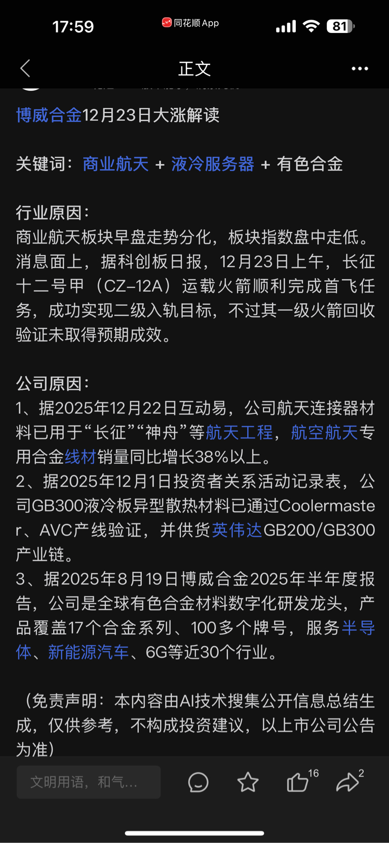 $博威合金(SH601137)$ 今天到底是商业航天补涨?还是炒液冷板?这个涨的真是莫名其妙!
