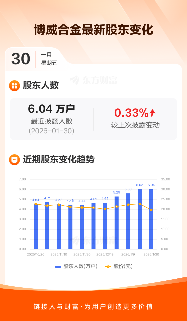 博威合金最新披露数据显示,截至1月30日公司股东户数为6.04万户,较上期(2026年1月20日)增加196户,增幅为0.33%。户均持有流通股数量由上期的1.47万股上升至1.52万股,户均持股金额由上期的33.41万元减少至29.95万元。